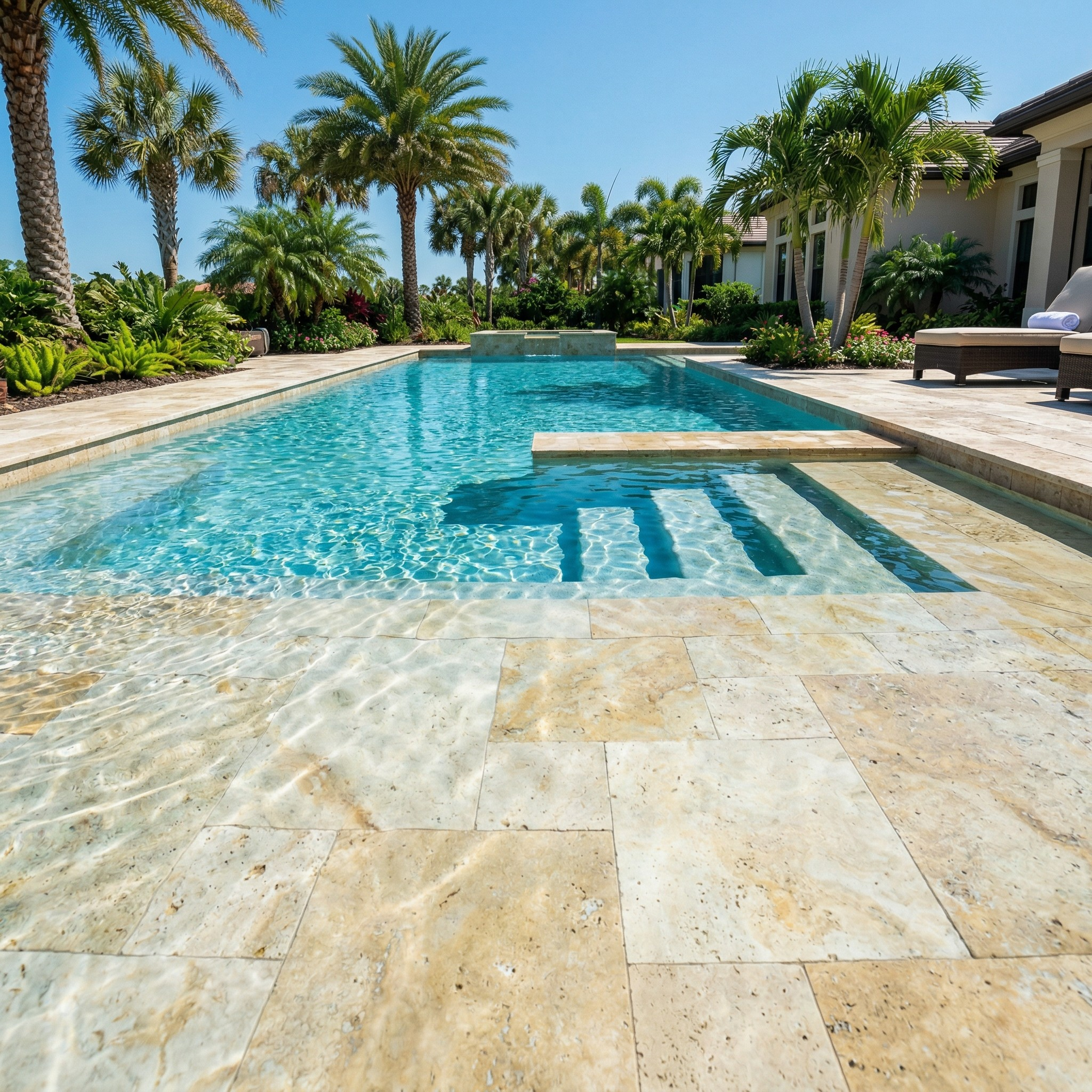 Travertine's natural texture provides good traction and its light color stays cooler underfoot than darker materials. Popular for its warm, natural aesthetic around Palm Coast pools. Travertine is porous and requires sealing at installation and periodic resealing — we include initial sealing in every travertine quote.