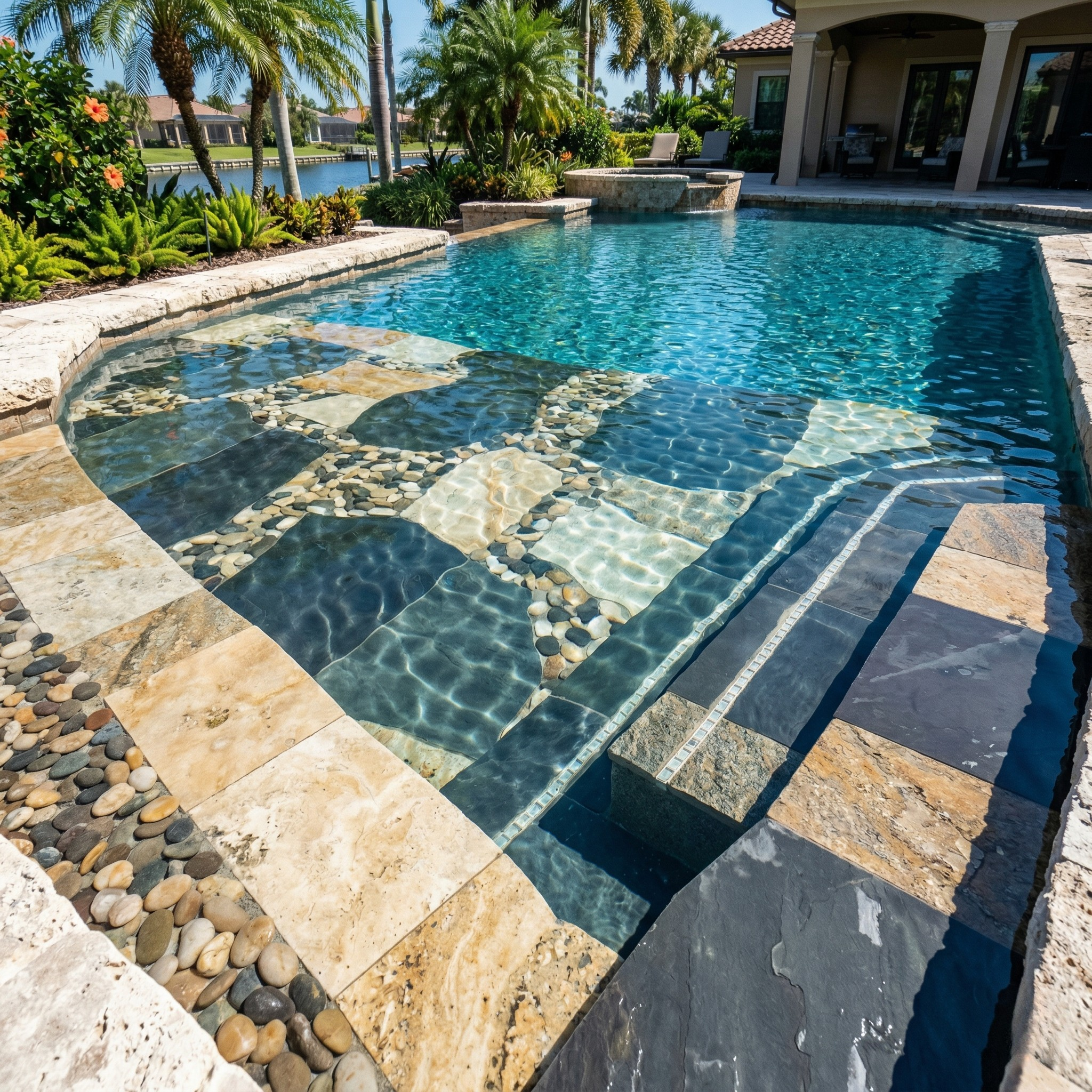 Slate's natural cleft texture provides excellent slip resistance and a distinctive look. Like travertine, natural stone requires sealing and more maintenance than porcelain in Florida's outdoor environment.